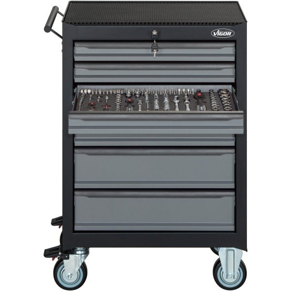 Εργαλειοφόρος τροχήλατος, σειρά Μ, 7 συρτάρια με 164 εργαλεία, σε μαλακές θήκες τακτοποίησης, με αφρώδη επιφάνεια εργασίας, ιδιαίτερα ανθεκτικός.