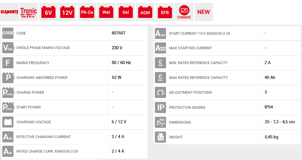 • Αυτόματη φόρτιση και συντήρηση σε λειτουργία TRONIC : Η τεχνολογία Tronic βασίζεται στην έξυπνη παρακολούθηση για τη διατήρηση της βέλτιστης φόρτισης και συντήρησης χωρίς να προκαλεί αλλοιώσεις ή τροποποιήσεις που βλάπτουν τη χημική δομή της μπαταρίας, ακόμη και σε παρατεταμένες περιόδους (π.χ. συντήρηση οχήματος σε περιόδους ακινησίας).Ο συνεχής έλεγχος της διαδικασίας φόρτισης αφενός αποτρέπει την πιθανή υπερφόρτιση και υπερθέρμανση της μπαταρίας και αφετέρου επιστρέφει την μπαταρία στην βέλτιστη κατάσταση. Το αποτέλεσμα είναι μια τέλεια φορτισμένη μπαταρία με μεγάλη διάρκεια ζωής.