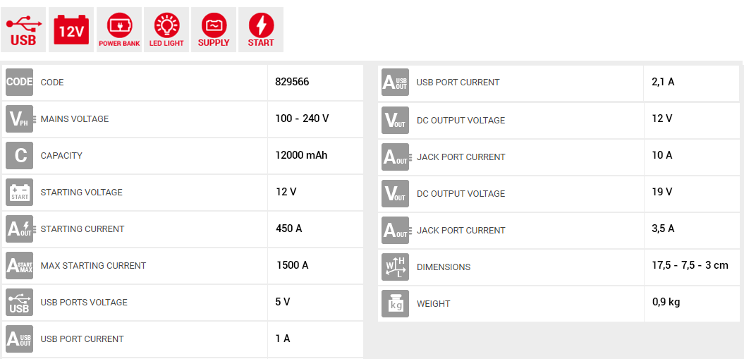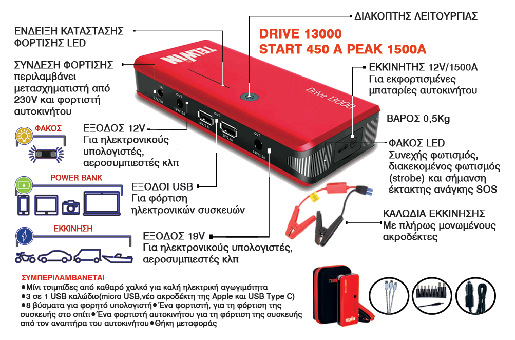 Τo TELWIN DRIVE 13000 είναι ένας πολύ ισχυρός (BOOSTER) εκκινητής 12V για αυτοκίνητα -ταχύπλοα-snowmobile κλπ.(βενζίνης-πετρελαίου ).• Λειτουργεί ως εφεδρική μπαταρία (POWER BANK).• Φορτιστής για smartphone PSP-mp3/mp4-tablets 5V. • Φορητή πηγή ρεύματος για laptop 19V.• Φορητή πηγή ρεύματος για φορητά ψυγεία αυτοκινήτου και άλλες συσκευές 12V • Φακός LED τριών τύπων : απλός φακός-flash -sos (alarm).• Διαθέτει λυχνίες στάθμης φόρτισης. • Προστασία από υπερφόρτιση και απενεργοποιείτε αυτόματα όταν δεν χρησιμοποιείτε.