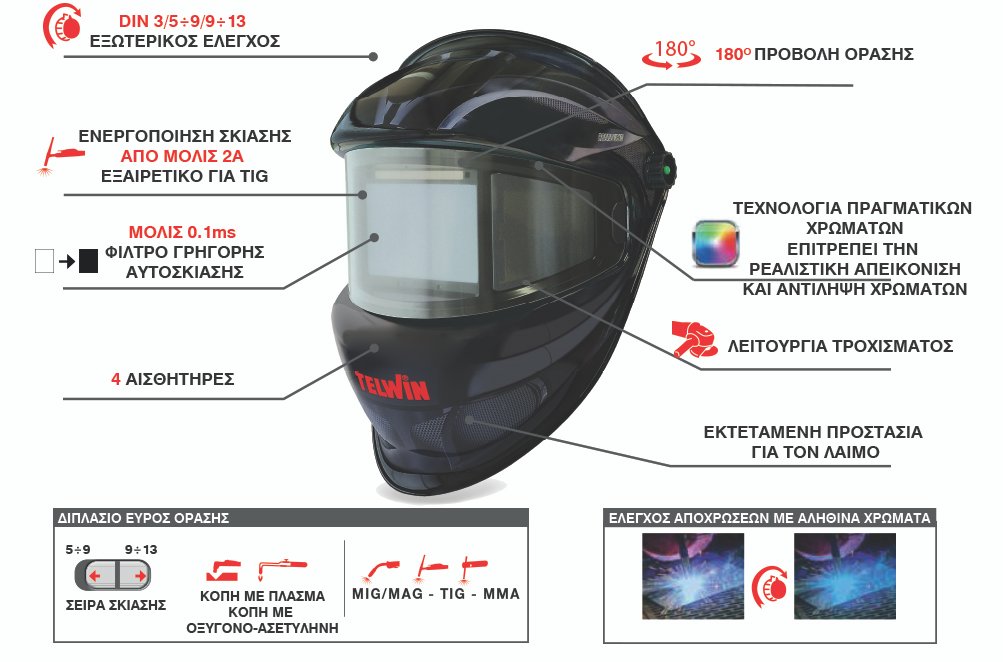Το φίλτρο υγρών κρυστάλλων LCD σκουραίνει αυτόματα όταν λειτουργεί το τόξο συγκόλλησης και επιστρέφει γρήγορα στη διαφανή του κατάσταση όταν το τόξο είναι απενεργοποιημένο. Αυτό σημαίνει ότι ο χειριστής δεν χρειάζεται να χαμηλώσει και να σηκώσει τη μάσκα του κατά τη διάρκεια των χειρισμών και του επιτρέπει να εργαστεί και με τα δύο χέρια ελεύθερα. Η τεχνολογία TRUE COLOR επιτρέπει στην Telwin ROUNDVIEW Helmet την ρεαλιστική απεικόνιση και αντίληψη χρωμάτων κατά τη διάρκεια των εργασιών συγκόλλησης. Η περιοχή προβολής 180° αυξάνει την ορατότητα του χειριστή κατά τη διάρκεια της εργασίας, βελτιώνοντας την άνεση σε κάθε θέση συγκόλλησης. Δεν διαθέτει μόνο ρυθμιστή ευαισθησίας φίλτρου ανάλογα με τη διαδικασία συγκόλλησης που πραγματοποιείται, αλλά διαθέτει επίσης εξωτερικό ρυθμιστή που μπορεί να καθυστερήσει το χρόνο μεταξύ των φάσεων σκίασης και φωτισμού όταν το τόξο συγκόλλησης έχει ολοκληρωθεί, ανάλογα με το επίπεδο φωτεινότητας της κόλλησης.