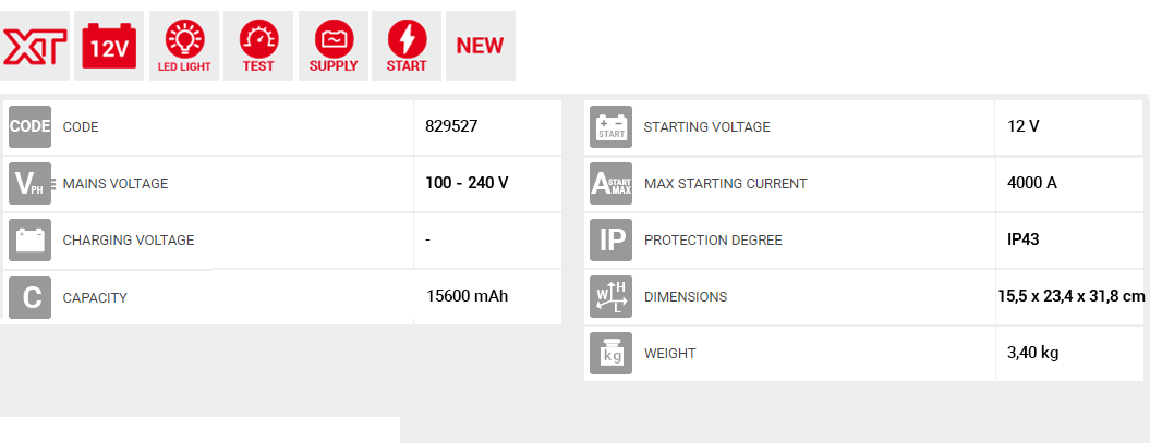 Η λειτουργία OVER RIDE του Telwin Startzilla 4012 XT επιτρέπει την εκκίνηση σε καταστάσεις έκτακτης ανάγκης όταν λείπει η μπαταρία (ή εντελώς αφόρτιστη). Είναι μια σταθερή και αξιόπιστη πηγή τροφοδοσίας για αλλαγές μπαταρίας (χωρίς να επηρεάζονται τα ηλεκτρονικά συστήματα του οχήματος). Στιβαρό και συμπαγές, είναι εξοπλισμένο με LED υψηλής έντασης.