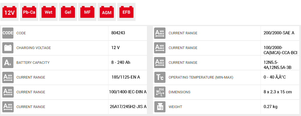 • Για μπαταρίες WET, GEL, MF, AGM, PbCa, EFB από 8-240 Ah στα 12V