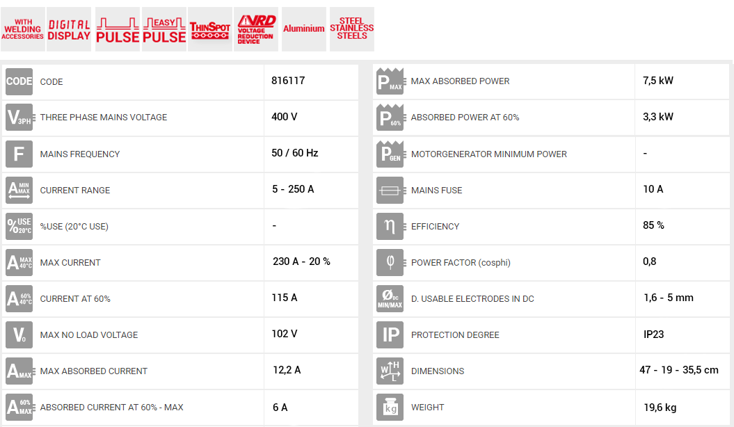 • Πλήρης με αξεσουάρ συγκόλλησης TIG.