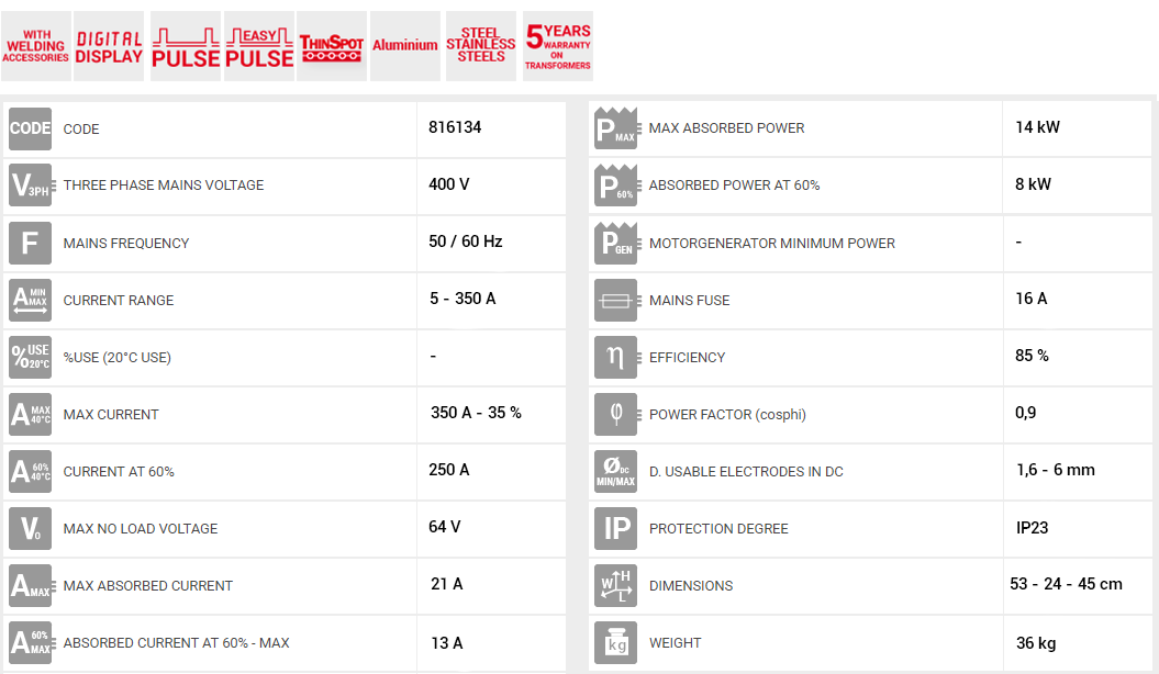 • THINSPOT : Eίναι μια υπερσύγχρονη λειτουργεία που επιτρέπει τη συγκόλληση TIG από λεπτό μεταλλικό φύλλο με εύκολο, γρήγορο και ακριβή τρόπο. Ιδιαίτερα σχεδιασμένο για χρήση σε ανοξείδωτο χάλυβα, μπορεί επίσης να χρησιμοποιηθεί σε χάλυβα και τιτάνιο. Ο έλεγχος του τόξου και η δυνατότητα καθορισμού των εξαιρετικά μειωμένων χρόνων εκκίνησης τόξου καθιστούν δυνατή τη σημαντική μείωση του θερμικού φορτίου κάθε κομματιού, μειώνοντας τον κίνδυνο διάτρησης που προκαλείται από υπερβολική υπερθέρμανση. Το αποτέλεσμα είναι ένα σημείο συγκόλλησης του οποίου η ποιότητα είναι παρόμοια με εκείνη του χρονισμού με λέιζερ, καθώς και η αυξημένη προστασία του βασικού υλικού (ειδικά από ανοξείδωτο ατσάλι), μειώνοντας την πιθανότητα διάβρωσης, ενώ επιτρέποντας υψηλότερες ταχύτητες εκτέλεσης, όλα αυτά λειτουργούν προς όφελος της παραγωγικότητας που είναι υψηλότερη σε σύγκριση με την παραδοσιακή μέθοδο συγκόλλησης TIG.