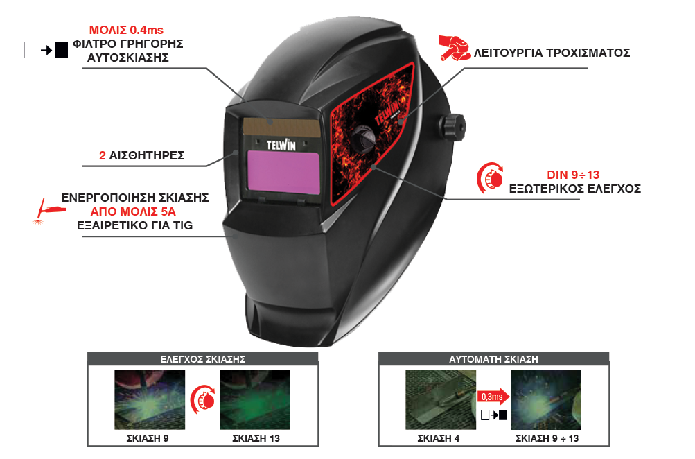 Αυτόματη ηλεκτρονική μάσκα ηλεκτροσυγκόλλησης TELWIN TRIBE 9-13 HELMET ιδανική για συγκόλληση TIG, MIG-MAG, MMA και λειτουργία τροχίσματος με εξωτερική ρύθμιση σκίασης (DIN 4/9 ÷ 13).